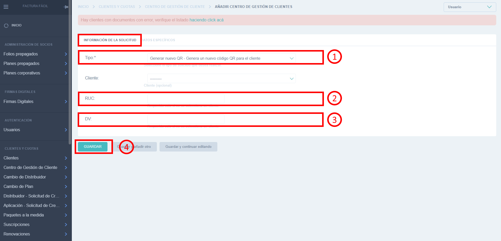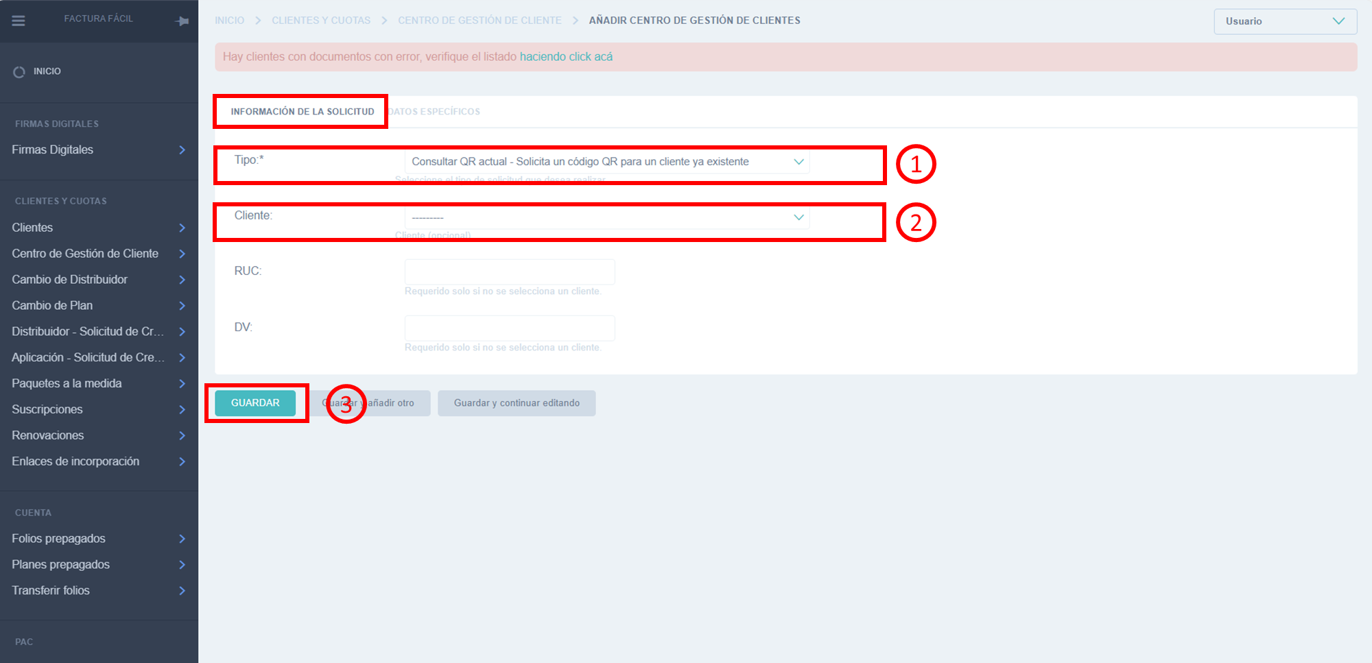 Ruta: -->-->Centro de Gestión de clientes --> +Añadir Centro de Gestión de cliente --> Seleccione Tipo (Generar nuevo QR) --> Colocar RUC y DV --> Guardar