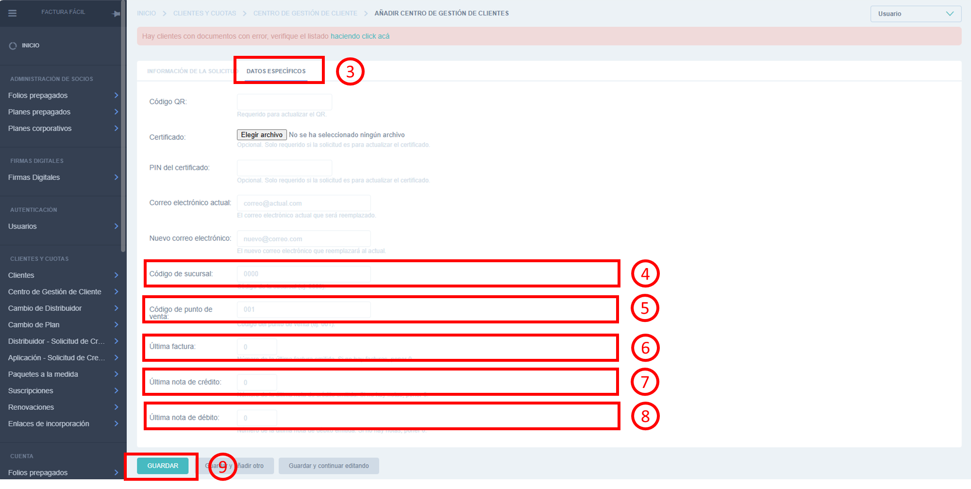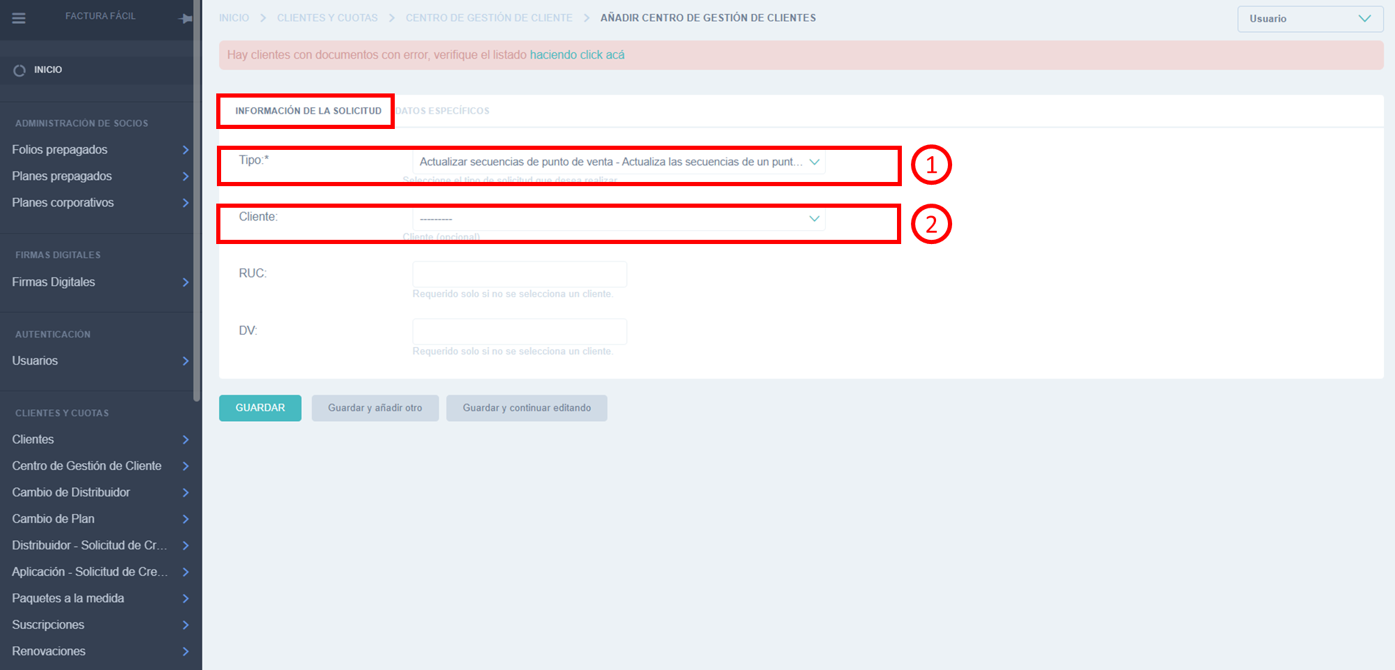 Ruta: -->Centro de Gestión de clientes --> +Añadir Centro de Gestión de cliente --> Seleccione Tipo (Actualizar Secuencia de punto de venta) --> Seleccione Cliente --> Datos específicos --> Código de Sucursal--> Código de Punto de Venta --> Ultima Factura (colocar el numero de la Factura) --> Ultima Nota de Crédito (colocar el numero de la ultima Nota de Crédito de no haber emitido ninguna colocar cero) --> Ultima Nota de Debito (colocar el numero de la ultima Nota de Crédito de no haber emitido ninguna colocar cero)-->Guardar