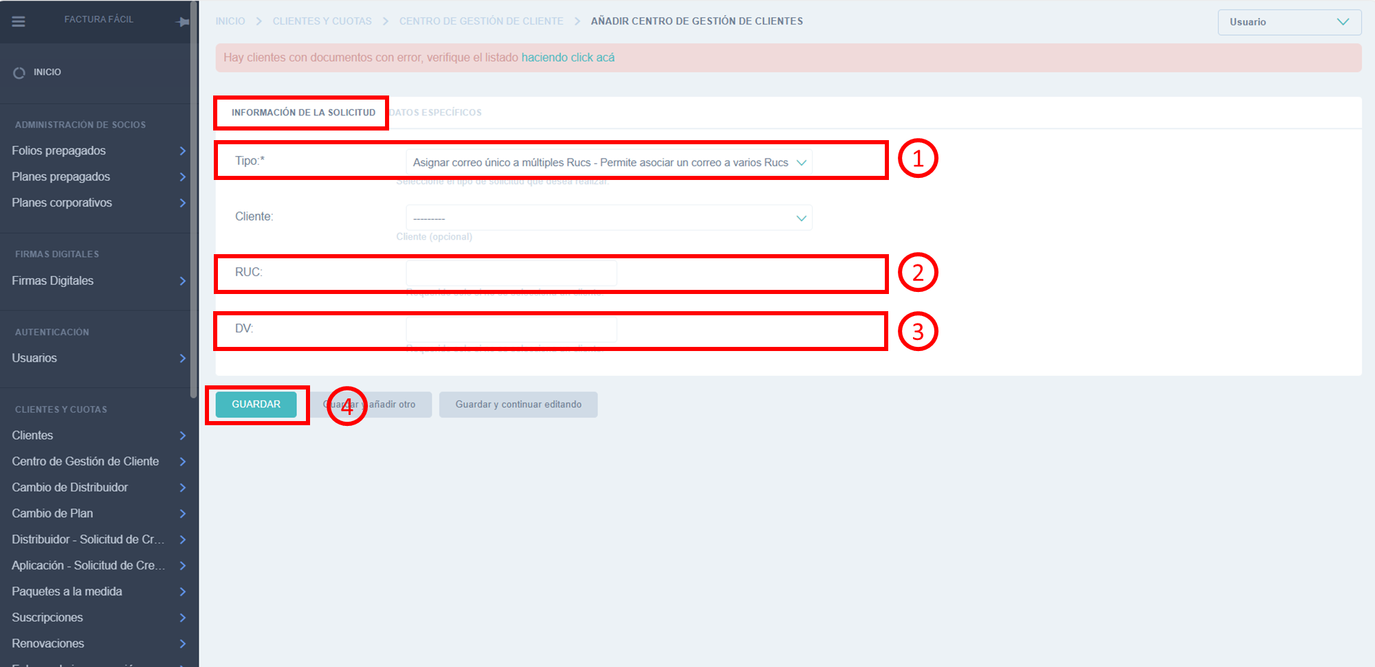 Ruta: -->Centro de Gestión de clientes --> +Añadir Centro de Gestión de cliente --> Seleccione Tipo (Asignar correo único a multiples RUC) --> Colocar RUC y DV ( Datos de el cliente a crear) --> Guardar