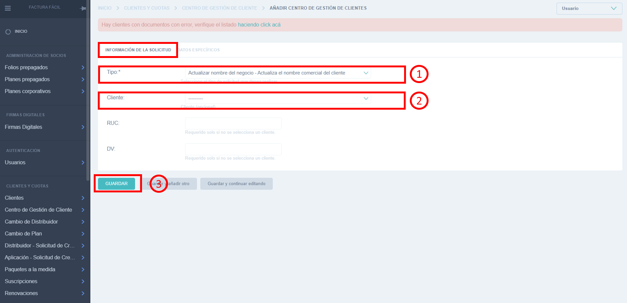Ruta: -->Centro de Gestión de clientes --> +Añadir Centro de Gestión de cliente --> Seleccione Tipo (Reenvió de documentos en error de receptores) --> Seleccione Cliente -->Guarda