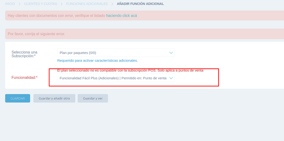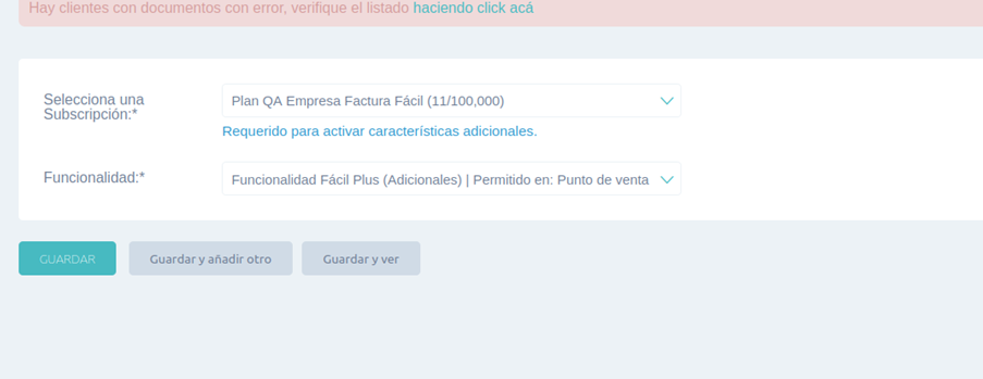 No permite habilitar una licencia Fácil App Plus si el tipo de suscripción es incompatible , solo aplica para suscripciones Tipo "Punto de venta"