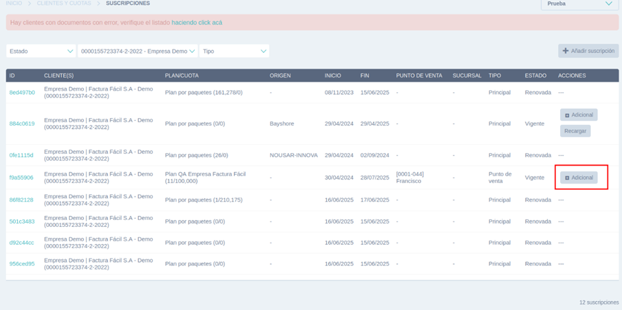 - Buscar la suscripción a la cual se le habilitara la licencia de Fácil App Plus. Se visualiza un botón llamado: Adicional. Seleccionar