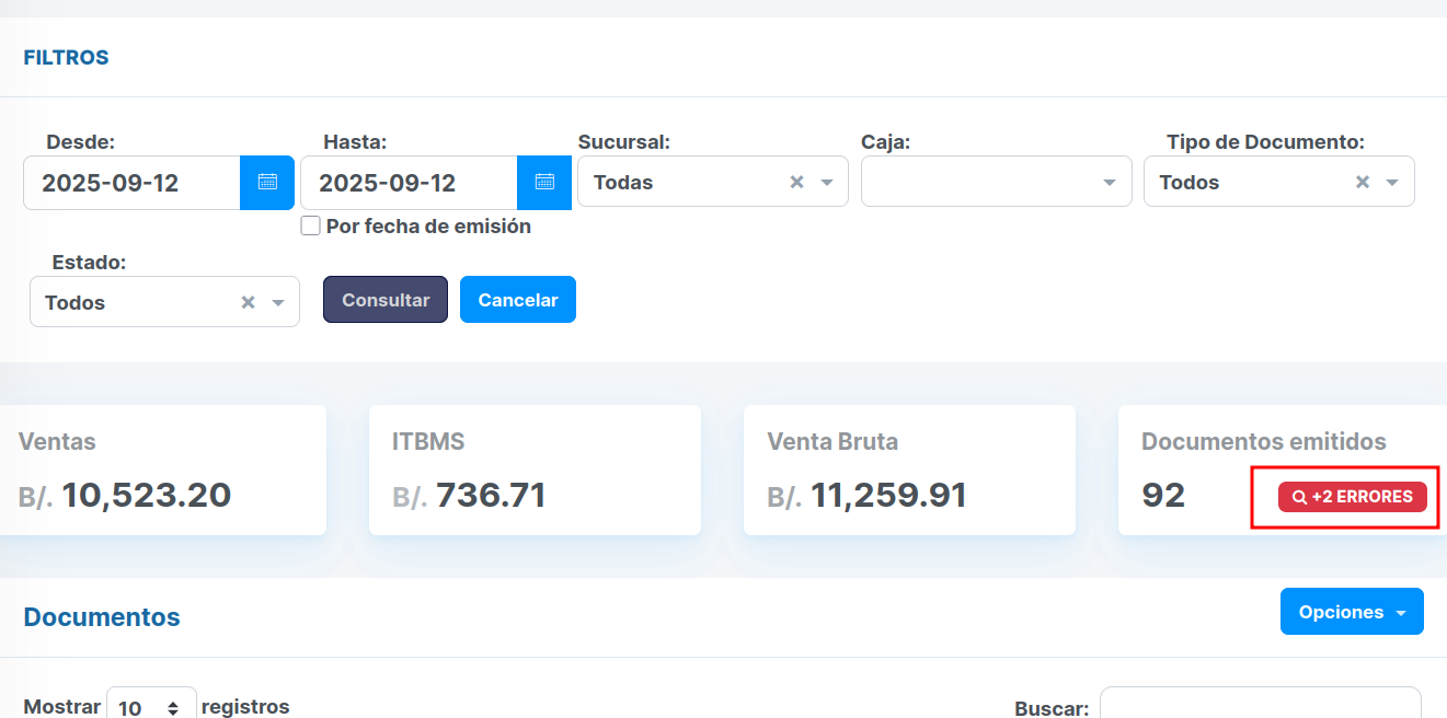 Ahora los errores no suman a los totales rápidos de ventas - ITBMS - venta bruta y documentos emitidos. Además a la derecha de la cantidad de documentos en errores hay un nuevo botón que indica la cantidad de errores y los muestra al darle click