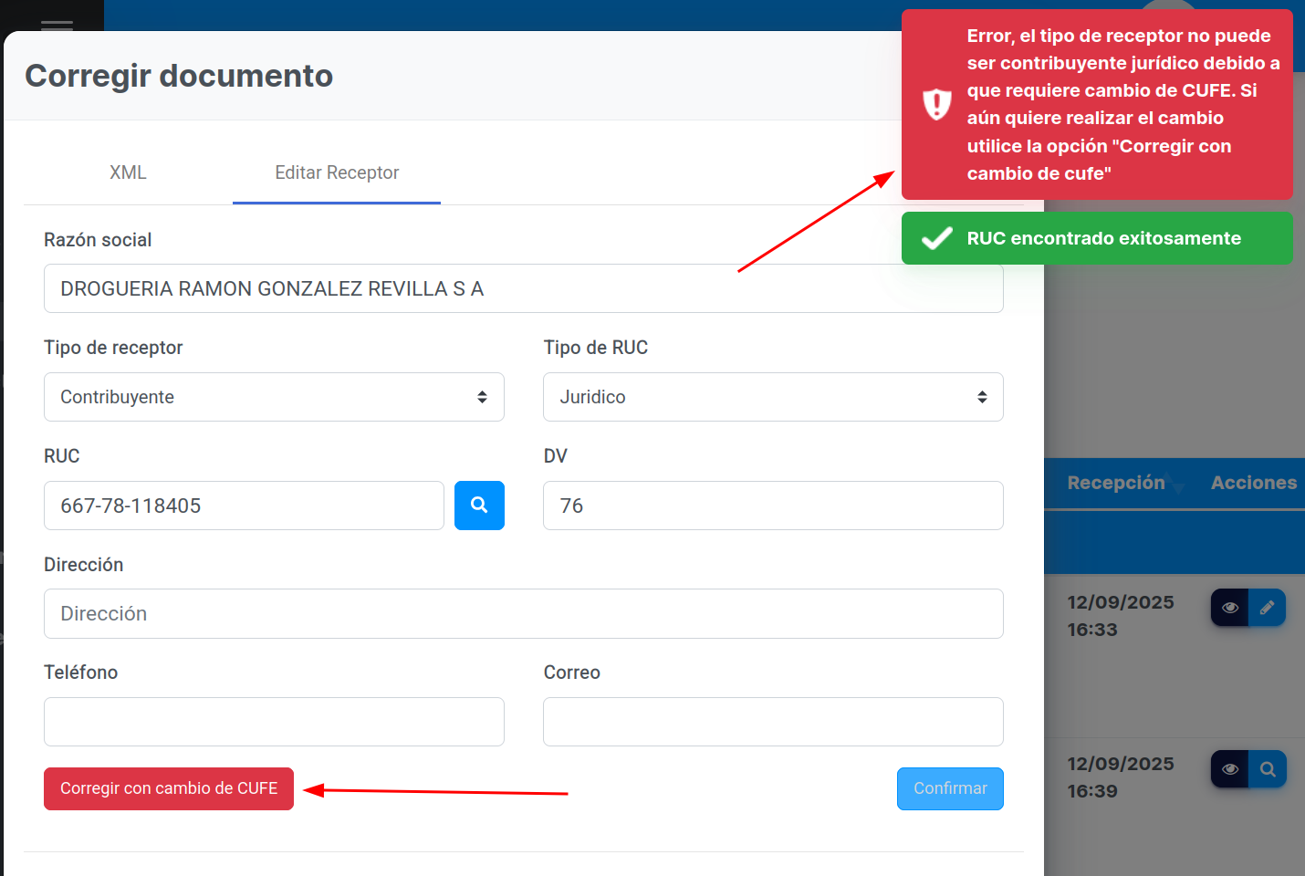 Al intentar corregir el receptor en esto tipo de documentos se muestra el siguiente mensaje: